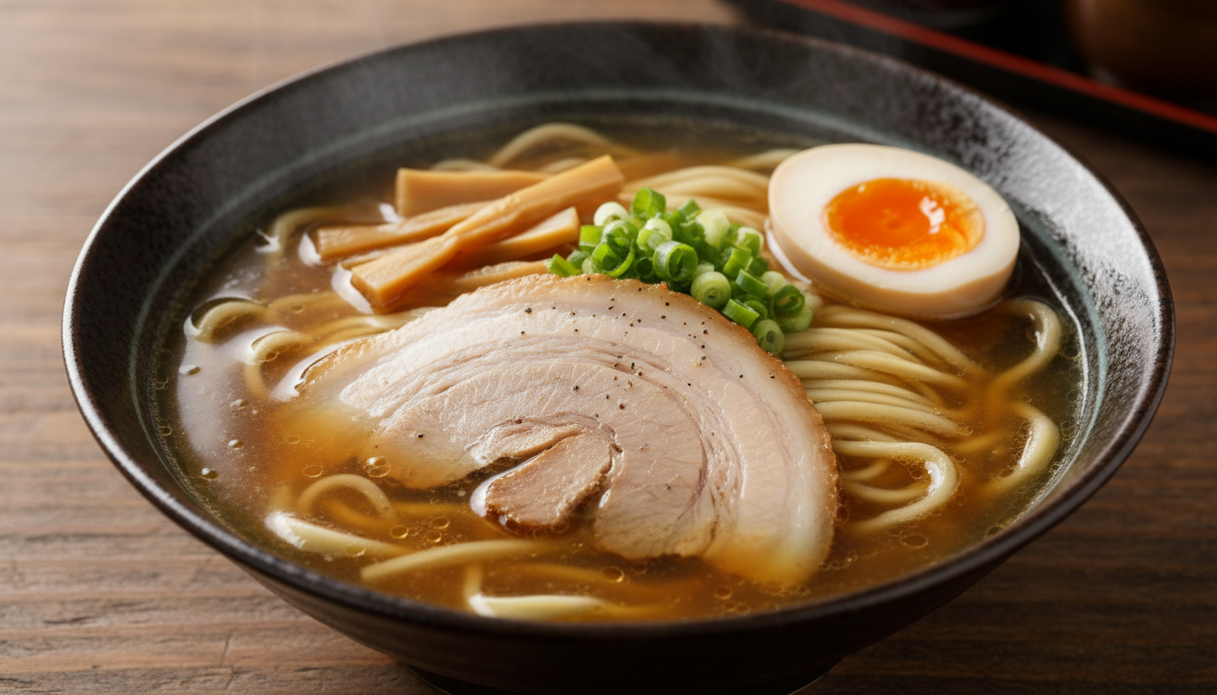 佐野ラーメンは、栃木県佐野市発祥のご当地ラーメンで、透き通ったあっさり醤油スープと平打ちの縮れ麺が特徴です。鶏ガラや昆布、煮干しなどをベースにしたスープは、旨みがありながらも軽やかで、麺の風味をしっかりと引き立ててくれます。透明度の高い黄金色のスープに、ツルツルと光沢のある麺が浮かぶ見た目も、シンプルでありながら上品な印象です。