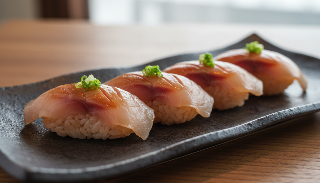 べっこう寿司は、漬けダレで染まった琥珀色の白身をシャリにのせた握り寿司で、見た目の艶とピリ辛の味わいが特徴です。