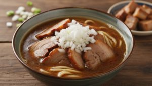醤油ベースの素朴なスープに、ラー油をたっぷり加えるというシンプルな構成が基本です。玉ねぎの甘みが辛味と混ざり合うことで、ほどよい「旨辛」バランスが生まれます。鰹節やチキンエキスなどのだしが下支えとなり、単なる辛さ以上の深みを感じられます。