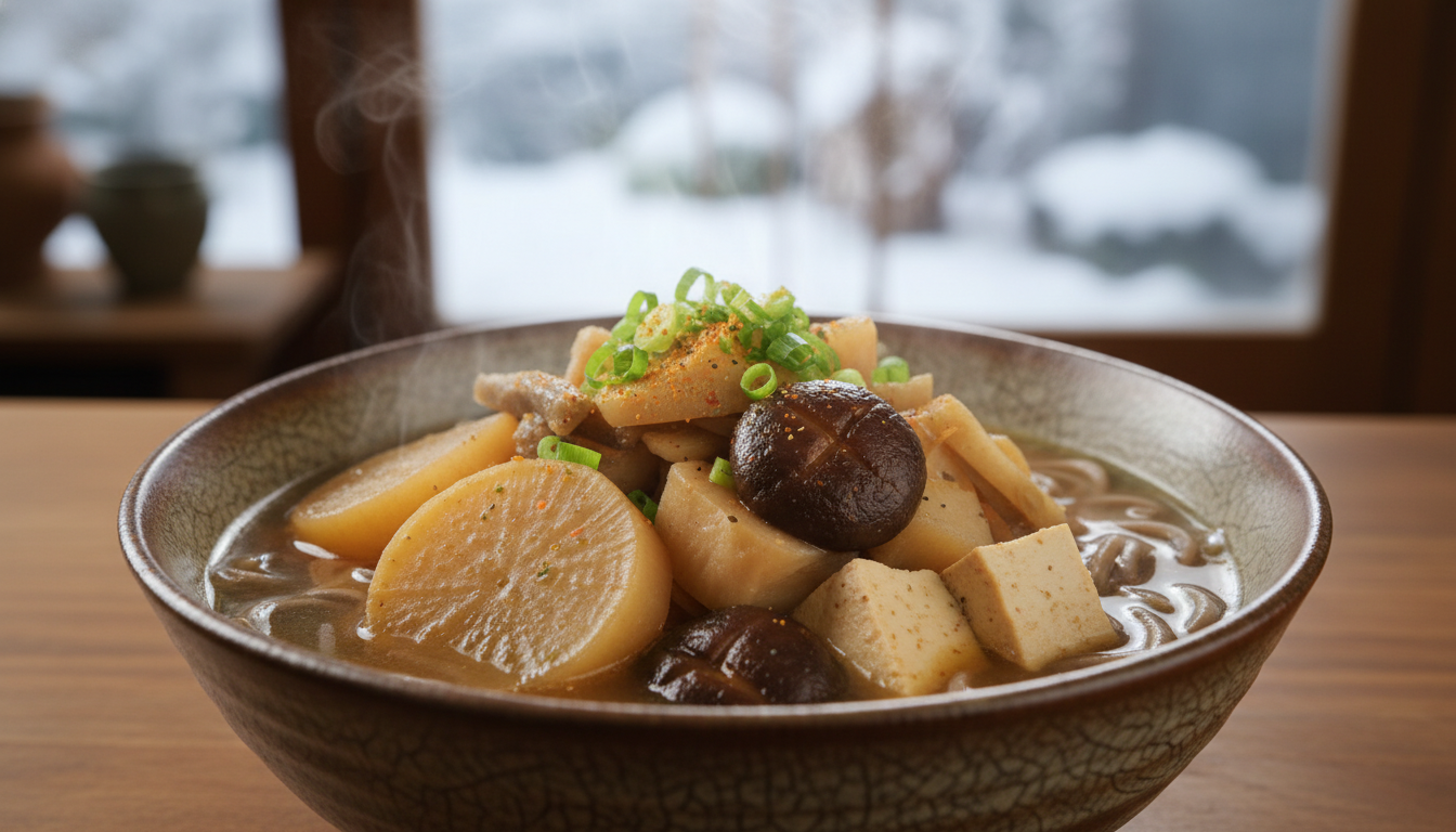痩せた土地でも育つそば、長く貯蔵できる大根・人参・ごぼう・里芋、そして大豆加工品を組み合わせた一杯は、寒さの厳しい県北の暮らしに寄り添いながら、体と心をあたためてきた存在です。