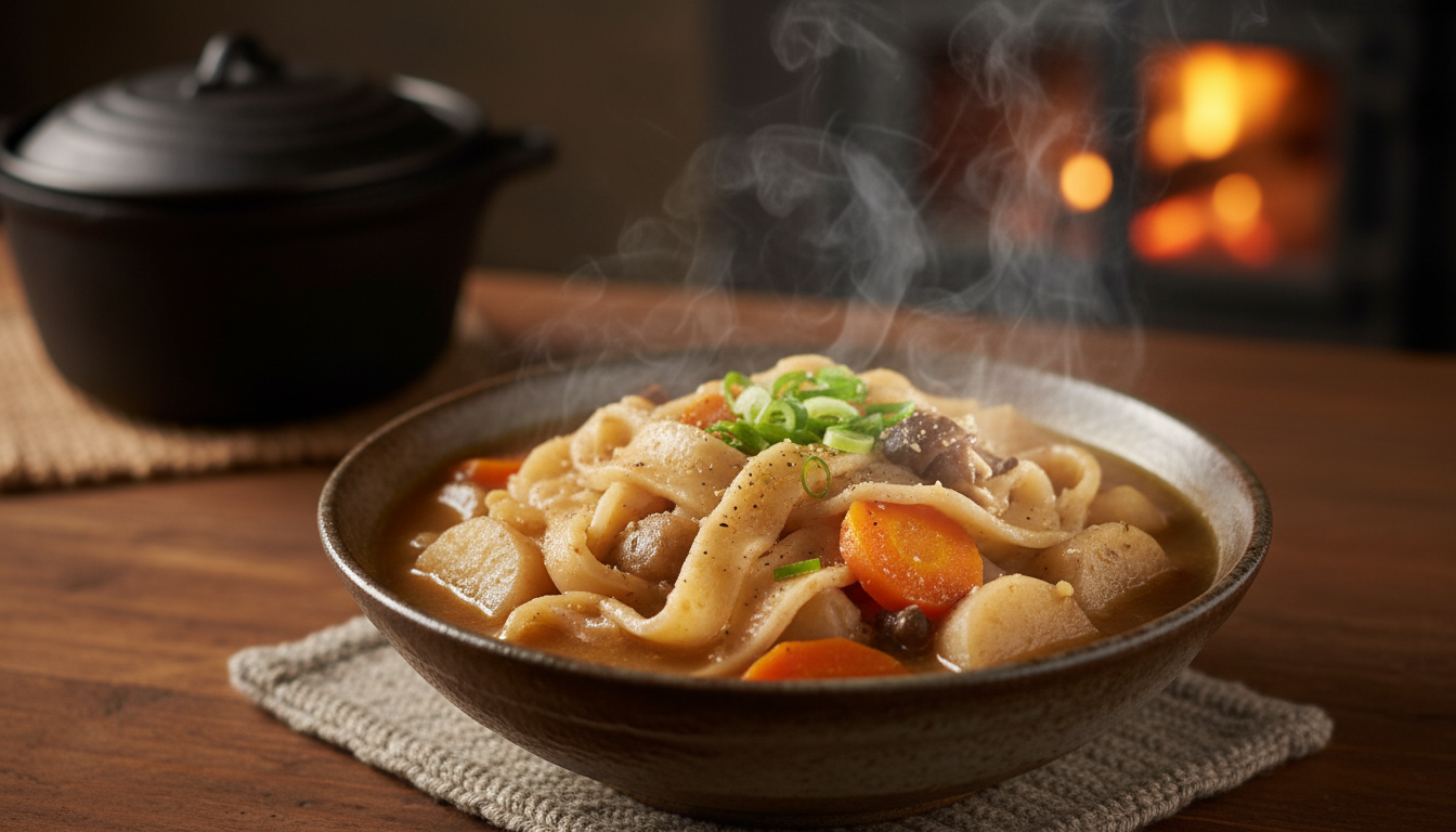 無塩の生麺を直接煮込むことで、煮汁の塩分が麺にほどよく染み込み、スープだけを濃くしなくても十分な食べごたえが出ます。里芋のぬめりと小麦粉のでんぷんがとろみをつけてくれるので、油を多く使わなくても「お腹の中からポカポカ温まる」一杯に仕上がります。保存がきく根菜をたっぷり使えるので、冬場の栄養源としても優秀です。