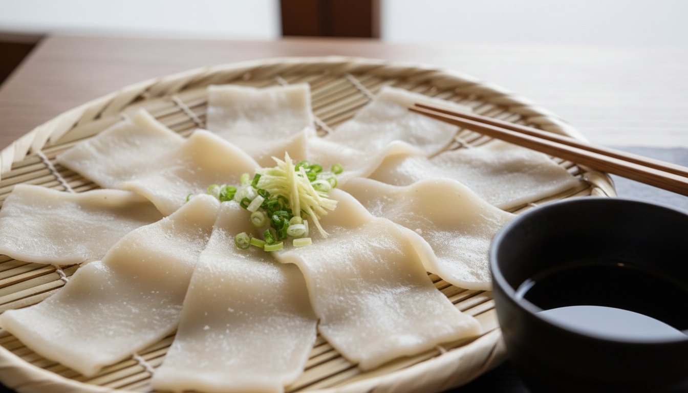 薄く伸ばした生地を熟成させることで表面が滑らかになり、ゆで上げるとツルツルとした舌触りと、内側のもっちり感が両立します。絹粉を加えるバリエーションでは、さらに滑らかさが増します。薄く広い形状にすることで、表面のデンプンが均一に糊化しやすく、つゆをよくまといながらもベタつきにくいのも特徴です。